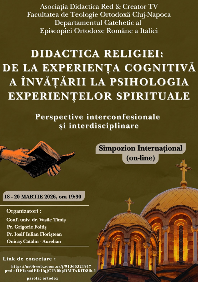 Societatea Științifică – Asociația Didactica RED, în parteneriat cu Departamentul Catehetic din cadrul Episcopiei Ortodoxe Române a Italiei, Facultatea de Teologie Ortodoxa din cadrul Universității ,,Babes Bolyai” din Cluj Napoca și Creator TV, va organiza, în perioada 18-20 martie 2026, conferința internațională ,,Didactica religiei, de la experiența cognitivă a învățării la psihologia experiențelor spirituale”.